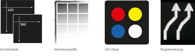 Über den LEDs liegt eine spezielle Anti-Reflex-Scheibe, die auch bei Tageslicht für höchste Erkennbarkeit sorgt. Dieses optische System mit Scheibe ist zugelassen und CE-geprüft. Zudem ermöglicht der äußerst geringe Energieverbrauch der LED-Technologie besonders lange Einsatzzeiten. Jedes LED-Wechselverkehrszeichen verfügt über eine auf einem Medium gespeicherte Bibliothek und lässt sich frei programmieren.